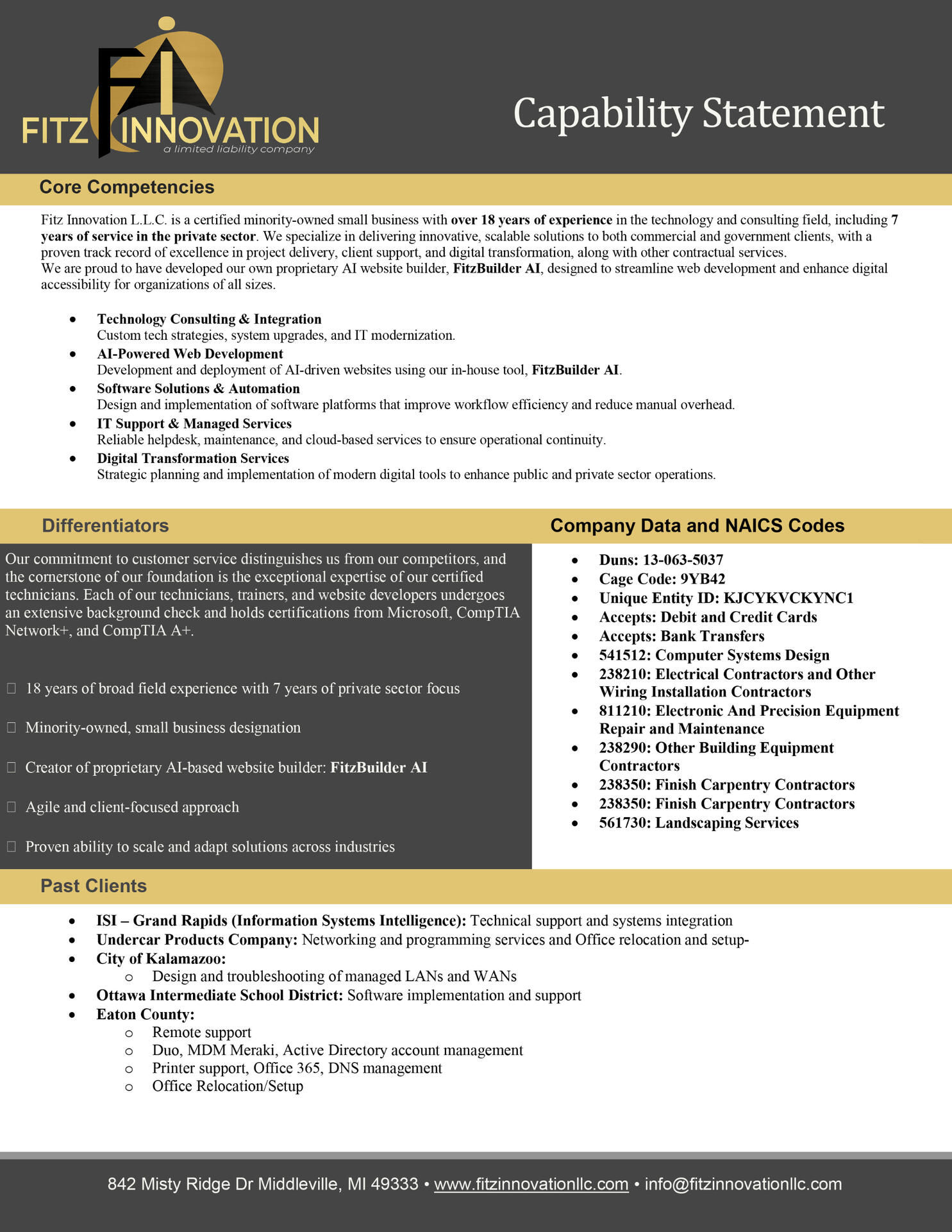 With a shared vision of delivering exceptional solutions, they combine a wealth of experience in IT services, cybersecurity, networking, graphic design, and creative branding. Together, they offer a dynamic blend of technical proficiency and creative ingenuity, ensuring our clients receive tailored, innovative solutions that drive success. At Fitz Innovation LLC, our leadership is committed to fostering trust, quality, and a forward-thinking approach in everything we do.
